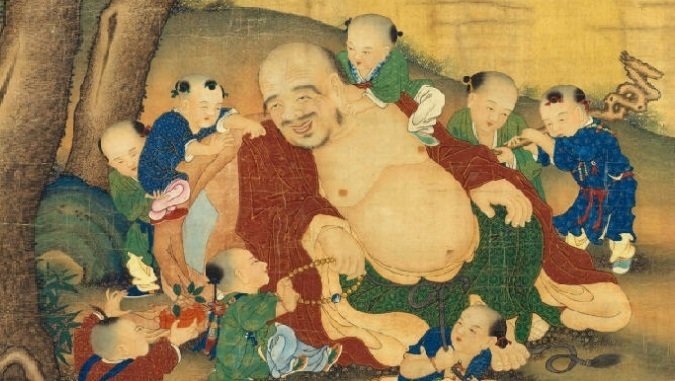 明末清初的一幅绘画《十子闹弥勒图》,但见画中弥勒体态丰腴,袒胸露腹,笑容可掬。看他右手提握佛珠,依着布袋而坐。周围的十名小童神态各异,颇为淘气顽皮,他们或是爬到弥勒的肩上,或是拉扯他的耳朵,或者扯要他的禅杖或佛珠。顽童的嬉戏和弥勒的慈祥,使画面栩栩如生。